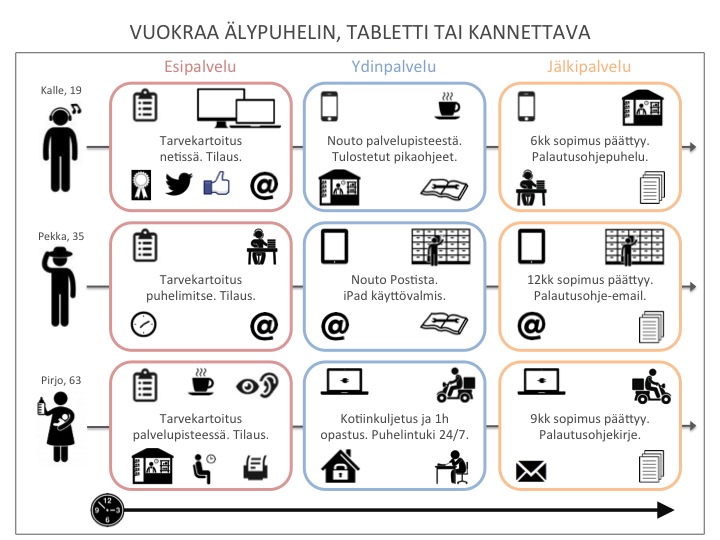 Lokakuun alussa julkaisin blogipostauksen ja nyt palaan aiheeseen. Suunnittelin palvelupolut kullekin asiakasprofiilille kyseistä kuvitteellista tietotekniikan vuokrauspalvelua varten. Palveluvaiheiden kontaktipisteet ovat kuvassa ikoneina. Tässä siis ovat suunnittelemani palvelupolut: