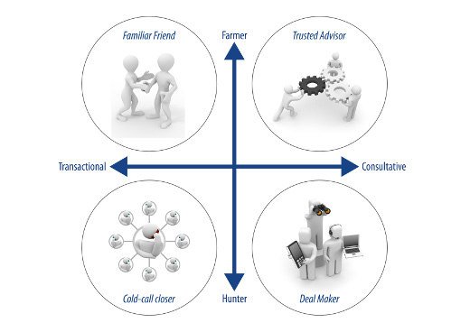 Yrityksen toimialasta ja yrityskulttuurista riippuen myyjien roolit ja tarvittava osaaminen sekä tekeminen vaihtelevat hyvinkin vaihtelevasti. Lisäksi myyjän persoona vaikuttaa hänen tapaan tehdä kauppaa, mutta introverttikin voi olla hyvä myyjä ja tehokas tapaamisten buukkaaja, kun vain on aito halu kehittyä ja löytyy hyvä valmentaja. Alla oleva kuva selkeyttää myyjien perustyylit. Asiantuntijapalveluita myytäessä usein tavoitellaan oikealla puolella olevia laatikoita eli konsultatiivisia huntereita tai farmereita. Tavoitteena minullakin on oppia myyjänä hankkimaan aktiivisesti uusia asiakkaita, mutta samanaikaisesti syventämään ja laajentamaan nykyisiä asiakassuhteita. Tämä on kenelle tahansa myyjänklopille haastavaa, mutta juuri siksi niin kovin mielenkiintoista.