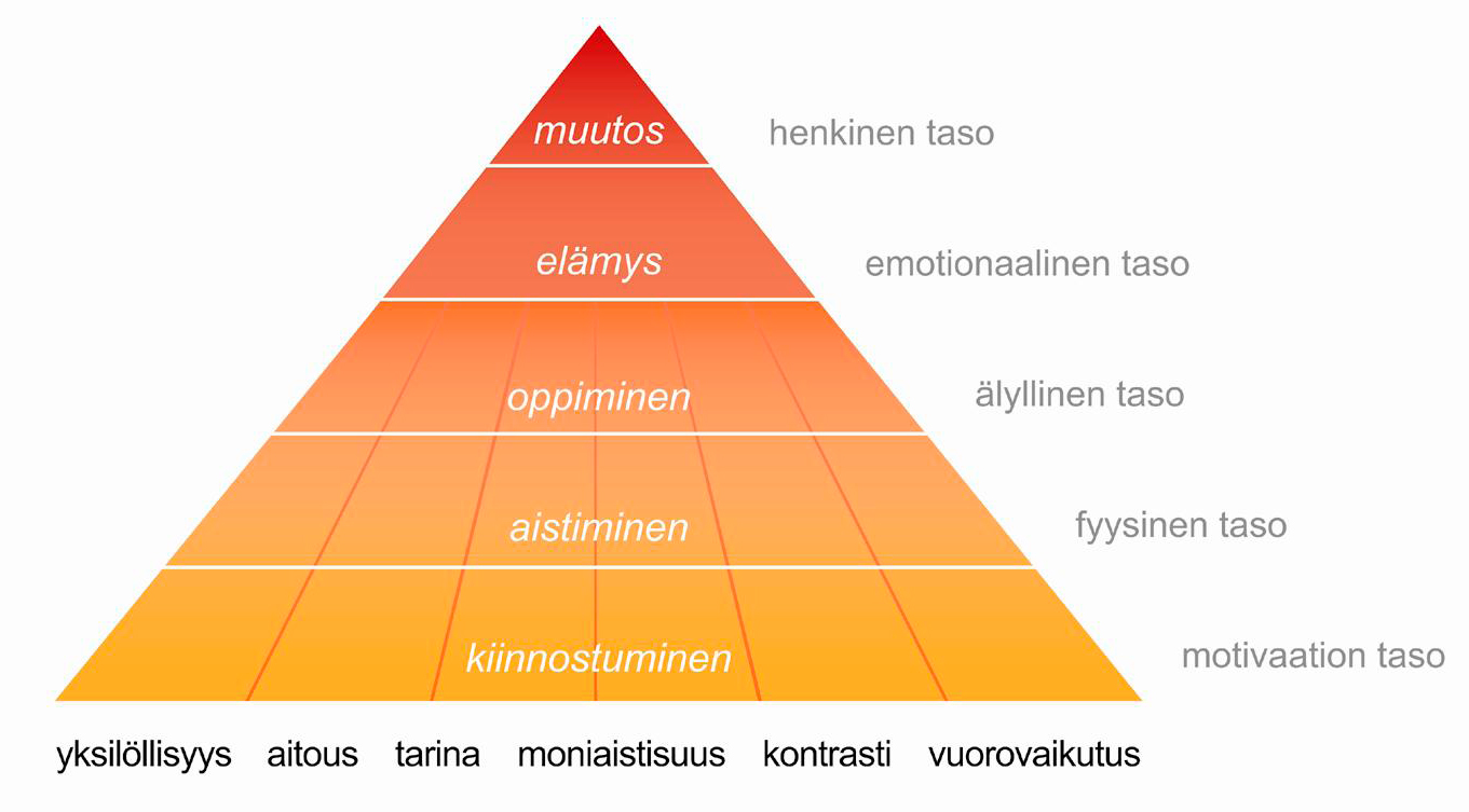 Lapin elämysteollisuuden osaamiskeskus LEO on kehittänyt alla olevan Elämyskolmio-mallin, jolla kuvataan elämyksen tuottamisen ja kokemisen tasot ja ulottovuudet.